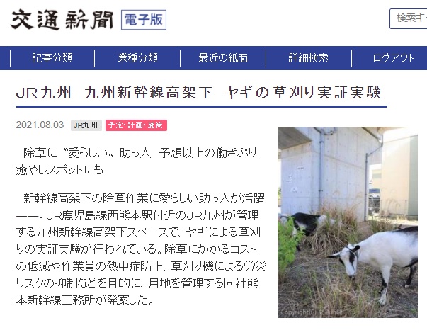 3 августа Японские железные дороги (JR) на острове Кюсю объявили, что будут использовать коз для прополки травы под линией высокоскоростных поездов Синкансэн. Это позволит компании сэкономить на зарплатах, внести лепту в защиту окружающей среды и уберечь работников от тепловых ударов.