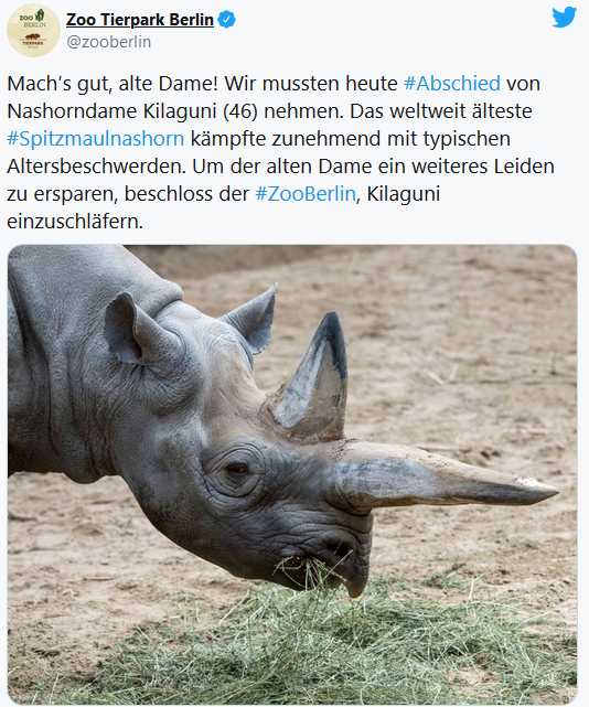 Как пояснили в Twitter зверинца, последние несколько лет Килагуни сильно беспокоили возрастные проблемы, поэтому чтобы избавить ее от мучений, зоологи решили усыпить носорога.