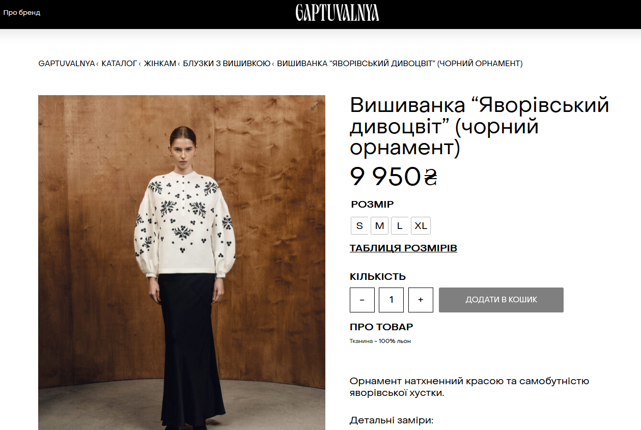 Gaptuvalnya - бренд, который создает изысканную вышитую одежду. Он рожден в Ивано-Франковске благодаря дизайнеру Наталье Гергелюк. В каждом своем изделии бренд сочетает современные силуэты и вышивку, демонстрируя, что народная культура существует вне времени.