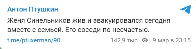 Подробнее об этом рассказал ведущий Антон Птушкин. В своем Telegram-канале он написал, что его коллеге удалось эвакуироваться, однако соседи режиссера, к сожалению, погибли. "Женя Синельников жив и эвакуировался сегодня вместе с семьей. Его соседи погибли", - говорится в сообщении.