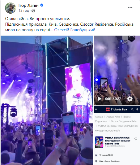 "Такая война. Вы просто ушлепки. Киев. Сердючка. Osocor Residence. Русский язык на сцене", - написал он.
