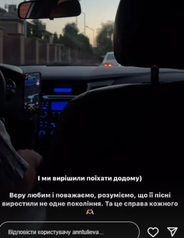"Все было хорошо, но есть одно но. Верка начала петь старые песни, которые на русском и нас триггернуло. Мы решили поехать домой. Веру любим и уважаем, понимаем, что ее песни вырастили не одно поколение. Но это дело каждого", – написала она.