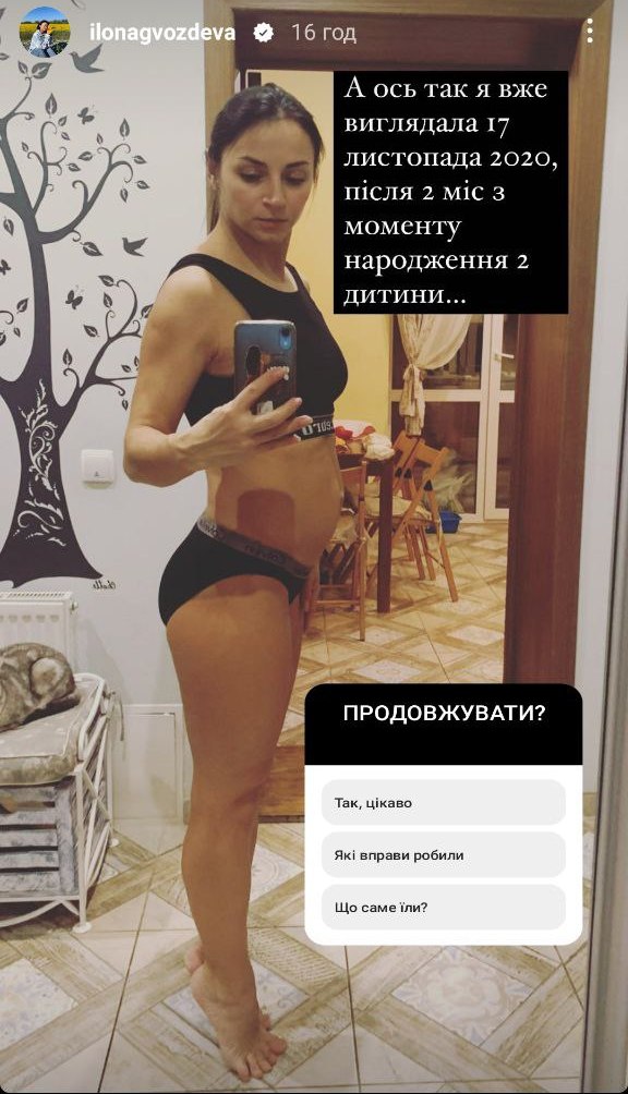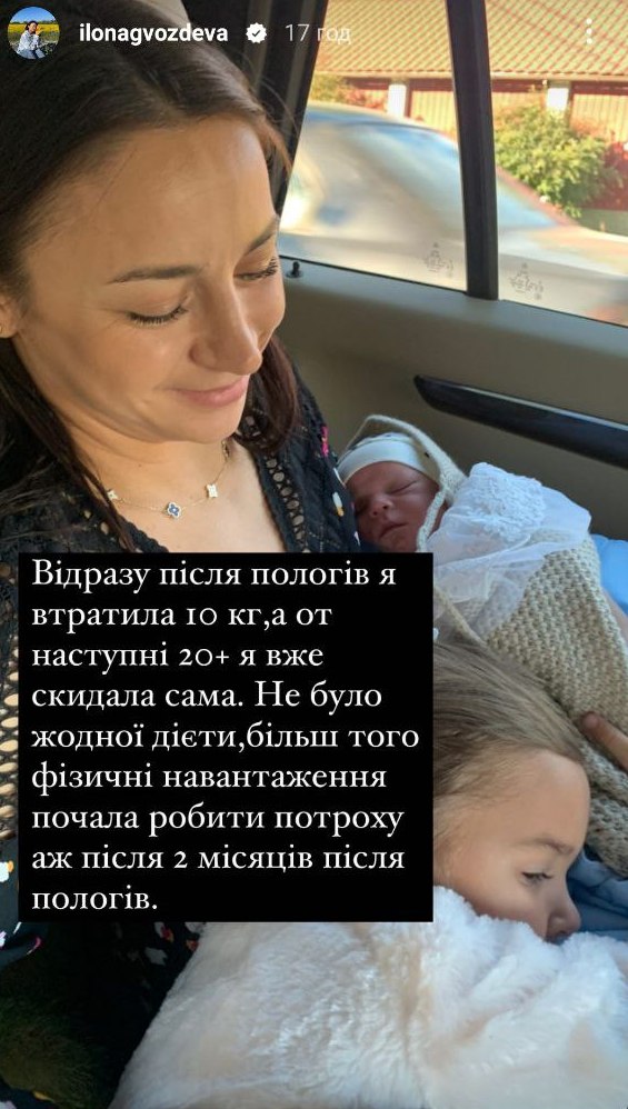 Сразу после выписки из роддома Илона носила специальное белье для утяжки живота и занималась танцами, поскольку тяжелые нагрузки во время грудного кормления делать нельзя.