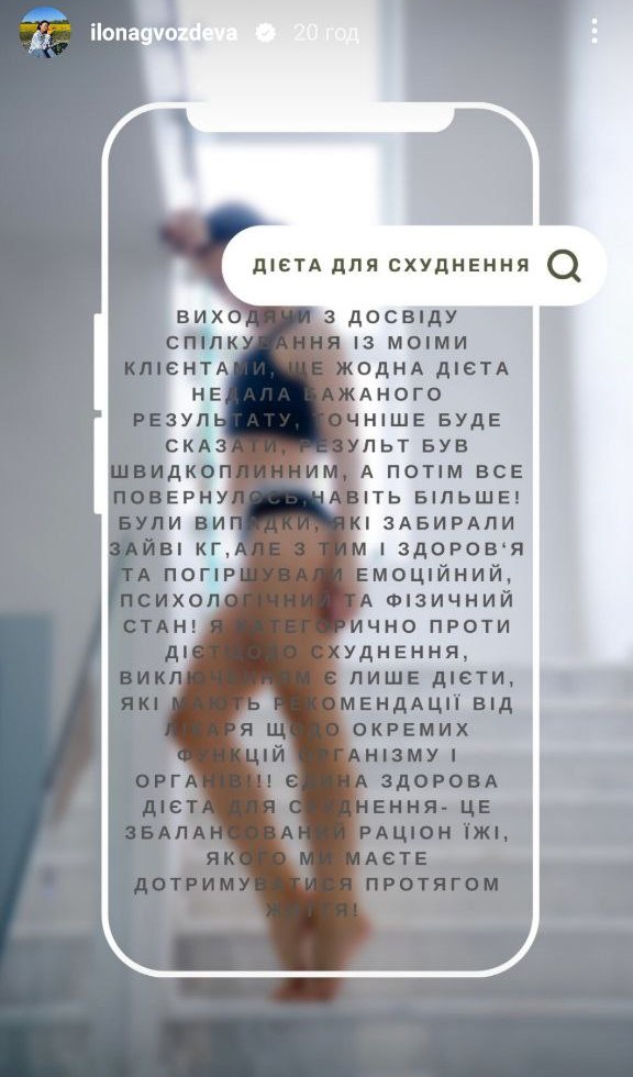 "Исходя из опыта общения с моими клиентами, еще ни одна диета не дала желаемого результата, точнее будет сказать, результат был быстротечный, а потом все вернулось, даже больше. Были случаи, которые забирали лишние кг, но с этим и здоровье и ухудшали эмоциональное, психологическое и физическое состояние. Я категорически против диет для похудения. Исключением являются диеты, которые имеют рекомендации от врача касательно отдельных функций организма и органов. Единственная здоровая диета - это сбалансированный рацион еды, которого вы должны придерживаться в течение жизни", - считает Илона.