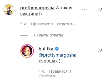 А что касается названия препарата, то Булитко решила его скрыть. "Хорошая", - ответила актриса на вопрос подписчицы о выбранной вакцине.
