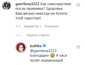 В комментариях стали расспрашивать о самочувствии звезды и какой вакцине она отдала предпочтение. На первый вопрос Виктория ответила не раздумывая: "4 часа полет нормальный".