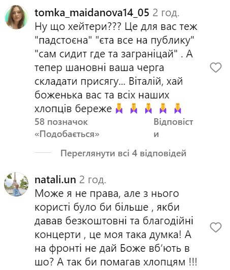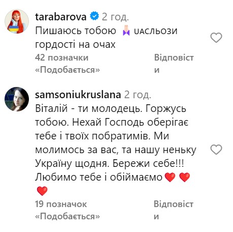 "Виталий, ты молодец. Горжусь тобой. Пусть Господь оберегает тебя и твоих побратимов. Молимся за вас, нашу Украину каждый день", - пишут фанаты. - "Спасибо Вам за мужество, берегите себя и своих побратимов, мы за вас молимся. Возвращайтесь живыми и здоровыми".