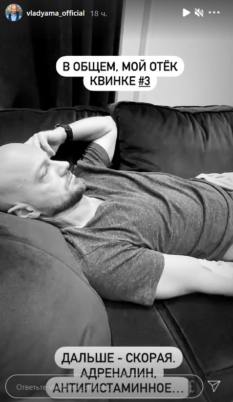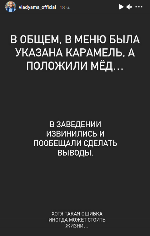 Этой неприятной историей танцор поделился в Instagram Stories. По его словам, в меню была указана карамель, но вместо нее добавили мед, который вызвал сильную аллергическую реакцию. У Влада стали опухать глаза, отекать гортань и появилось удушье - так проявляется отек Квинке.