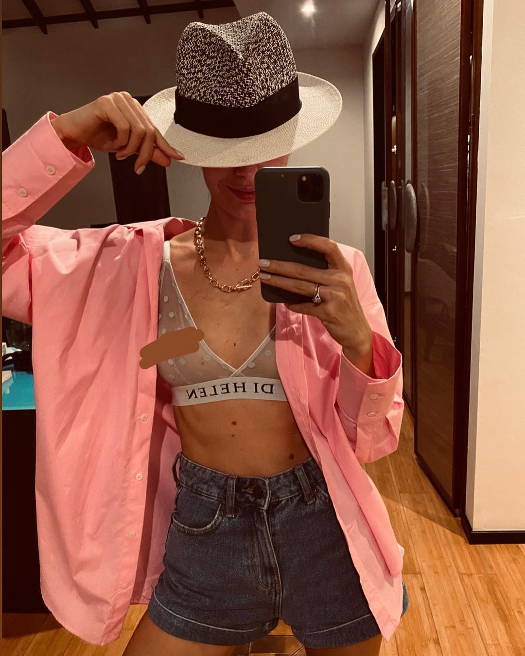 Горняк в свою очередь показала фотографию в одежде, но с пикантной деталью. "Добавлю красок и огня", - подписала нотариус снимок, на котором позирует перед зеркалом в шортах, рубашке и прозрачном белье.