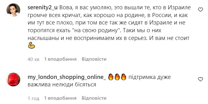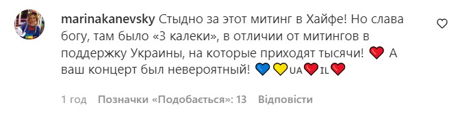 "На следующий день мы выступали в Хайфе, и туда начали поступать письма, в которых говорилось, что мы разжигаем ненависть к россиянам. Серьезно?! А еще через день там прошли митинги в поддержку тех, кого притесняют. Ну, понимаете, мы выступаем, собираем деньги для Украины, поддерживаем и общаемся с теми, кто вынужден был временно переехать. Напоминаем миру, что война продолжается и надо продолжать делать все что только можно ради победы Украины, приводим факты, показываем происходящее в стране…. А после террористического нападения в Виннице они (россияне) делают митинг, потому что их притесняют и ненавидят. Как говорят "karma is a b*tch". Она очень быстрая и сильная. Каждого догонит".