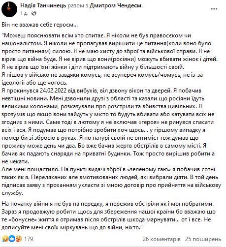 "Можешь объяснять всем кто спросит. Я никогда не был правосеком или националистом. Я никогда не пропагандировал решить этот вопрос (когда он был просто вопросом) силой. У меня нет таланта к оружию и военному делу. Я не верил что война будет. Я не верил что они (россияне) могут убивать женщин и детей. Я не верил, что их женщины и дети поддержат войну в большинстве своем. Я пошел в армию не благодаря кому-то, не вопреки кому-то, не из-за идеологии или еще чего-то. Я проснулся 24.02.2022 от взрывов, звон звона окон и дверей. Я увидел нелестные новости. Мне звонили друзья из области и говорили, что россияне едут по большим колоннам, рассказывали о расстрелах и убийствах гражданских. Я понял что если они зайдут в город то будут убивать или пытать всех не согласных с ними. Именно тогда в феврале я не включал "героя" и не ринулся спасать всех и вся. Я подумал что нужно сделать хоть что-нибудь… в худшем случае я умер бы с оружием в руках", - передала она слова Дмитрия.