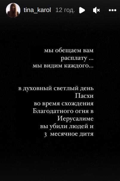 "В духовный светлый день Пасхи, во время схождения Благодатного огня в Иерусалиме вы убили людей и трехмесячное дитя, - написала Тина Кароль в Instagram. - Мы обещаем вам расплату. Мы видим каждого".