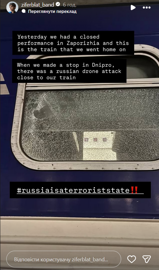 "Вчера у нас было закрытое выступление в Запорожье и это поезд, на котором мы возвращались домой. Когда мы остановились в Днепре, произошла российская атака дронами вблизи нашего поезда", - говорится в сообщении группы.