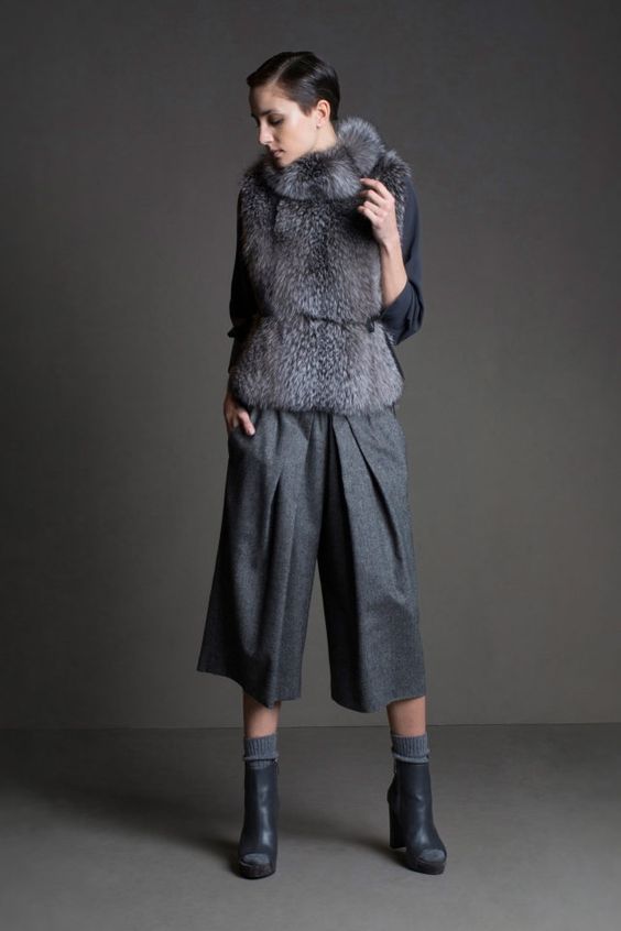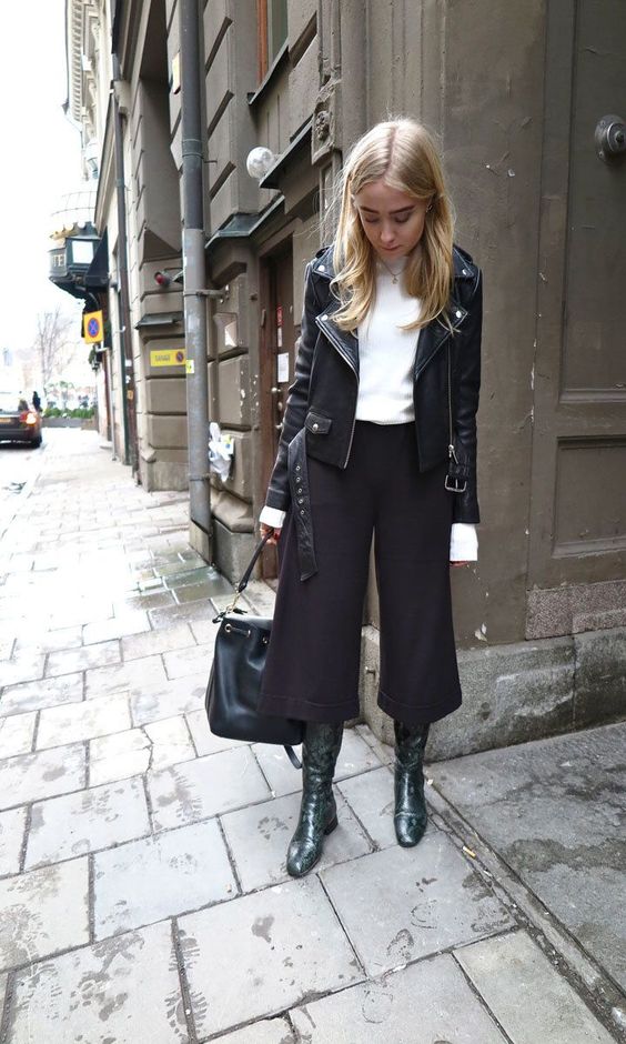 Широкие брюки-кюлоты рекомендуется носить в зимний сезон с высокими сапогами, которые должны полностью закрывать лодыжку. Такая обувь отлично защитит от холода и влаги, что важно и практично.