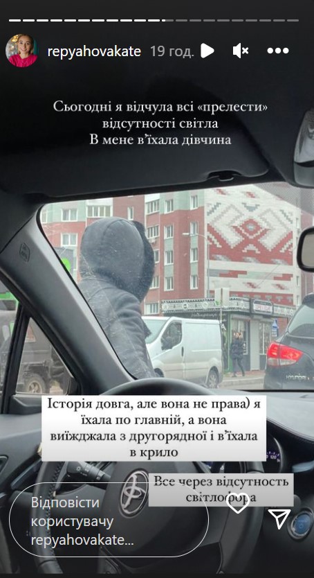 "Сегодня я почувствовала "прелести" отсутствия света. У меня въехала девушка. История длинная, но она не права. Я ехала по главной, а она выезжала из второстепенной и въехала в крыло. Все из-за отсутствия светофора", - написала блогер в Instagram.