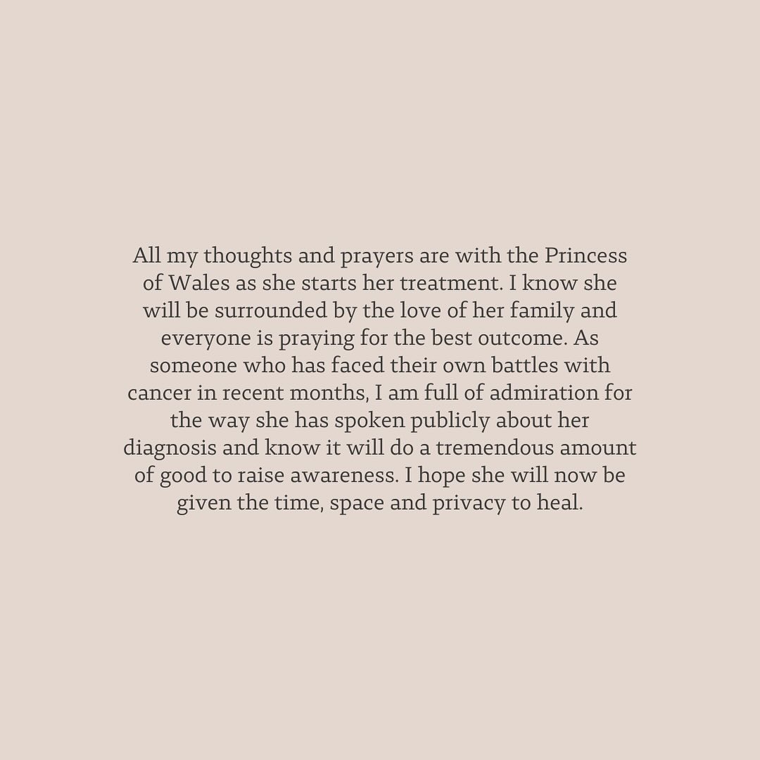 "Все мои мысли и молитвы с принцессой Уэльской, которая начинает лечение. Я знаю, что она будет окружена любовью своей семьи и что все молятся за лучший исход. Как человек, который в последние месяцы столкнулся с собственной борьбой с раком, я восхищаюсь тем, как она публично рассказала о своем диагнозе. Знаю, что это принесет огромную пользу для повышения осведомленности", - написала она.
