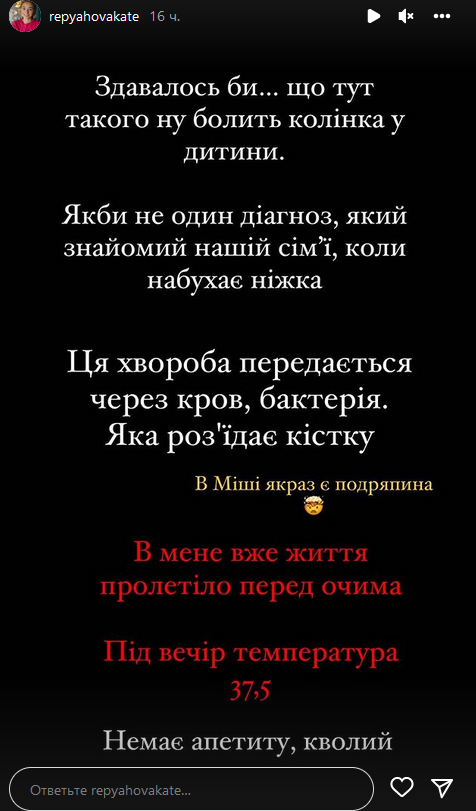 "Казалось бы, что тут такого, ну болит коленка у ребенка. Если бы ни диагноз, который знаком нашей семье, когда опухает ножка. Эта болезнь передается через кровь, бактерия, которая разъедает кость. У Миши как раз есть царапина. У меня вся жизнь пролетела перед глазами. Под вечер температура 37,5. Нет аппетита, вялый", - рассказала Екатерина.