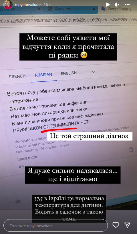 К счастью, остеомиелит не подтвердился, в крови признаков инфекции нет. "Можете себе представить мои чувства, когда я прочитала эти строки, - поделилась она эмоциями. - Я очень сильно испугалась, еще и улетаем".