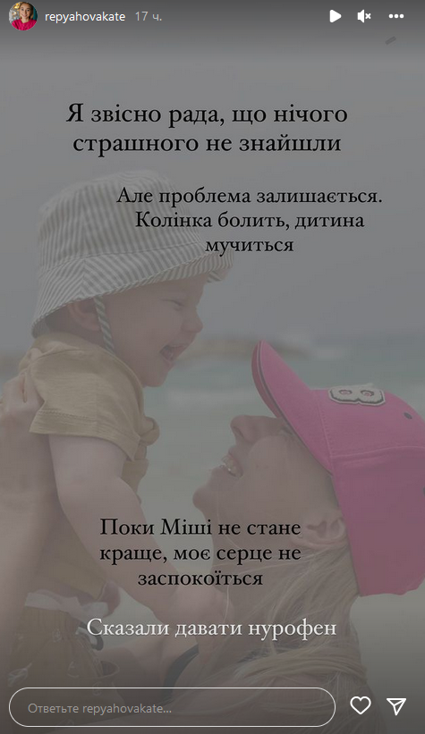"Я конечно рада, что ничего страшного не нашли, но проблема остается. Колено болит, ребенок мучается. Пока Мише не станет лучше, мое сердце не успокоится", - добавила молодая мама.