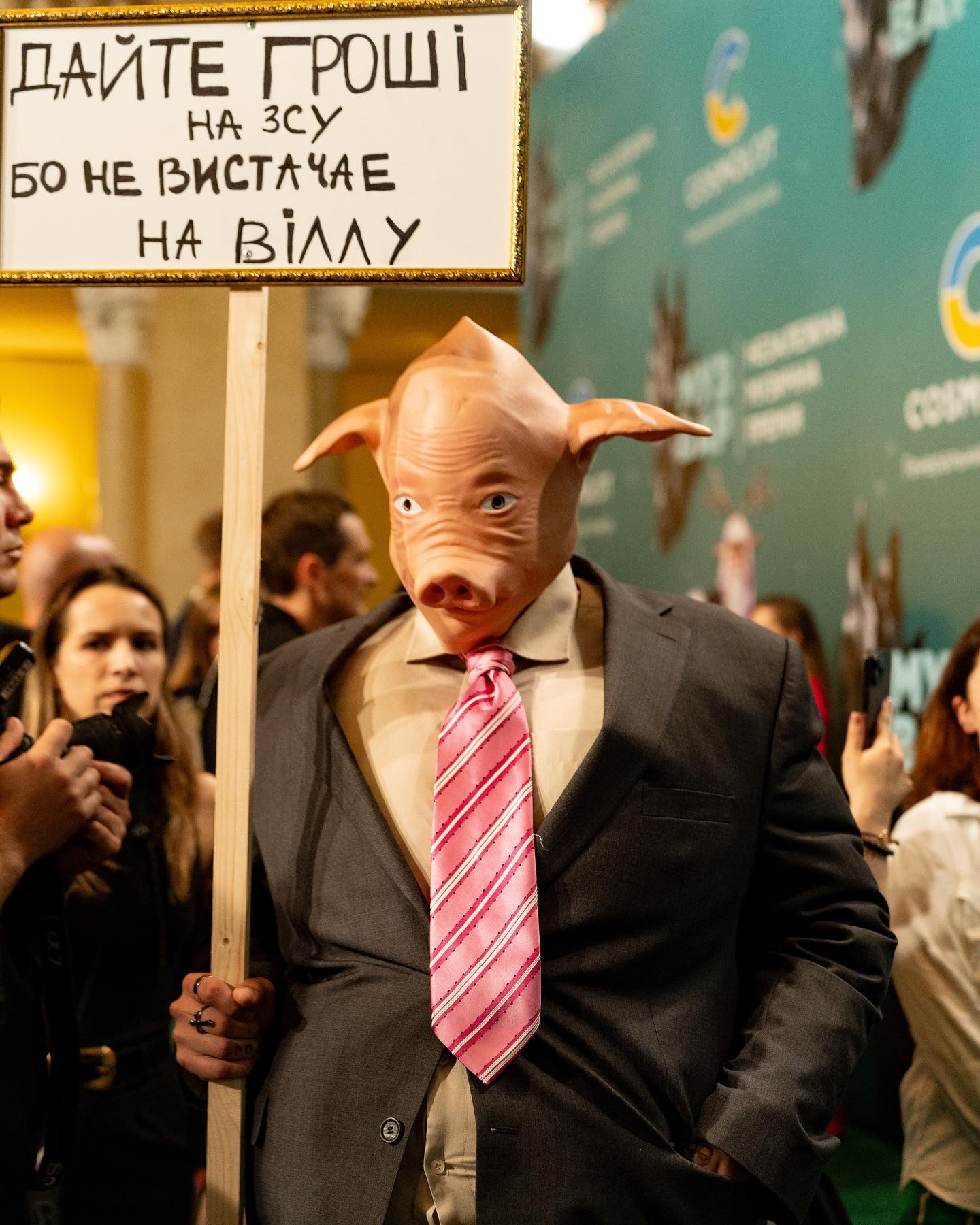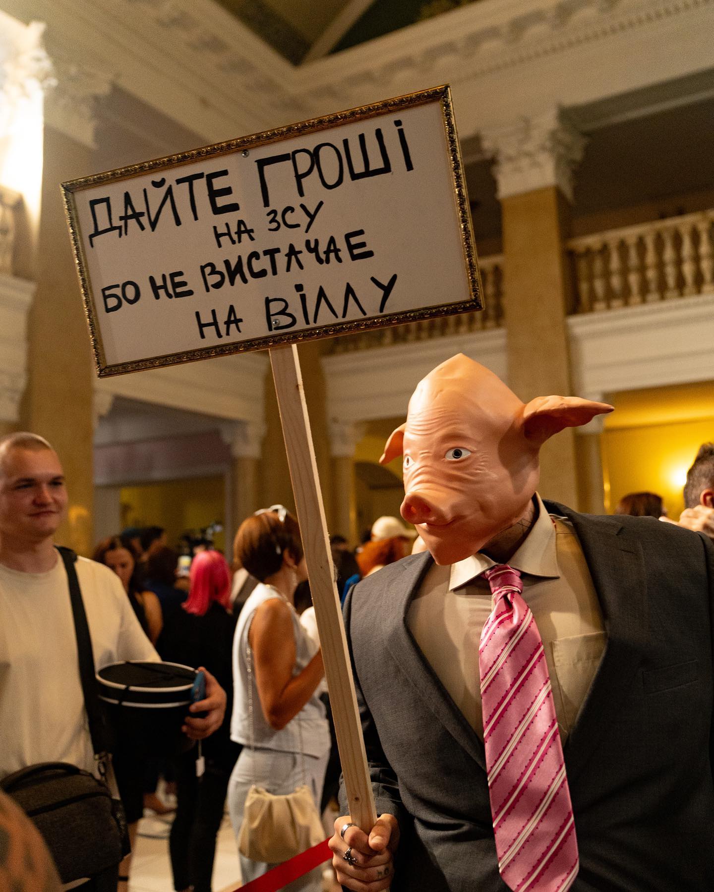 Таким образом, певец решил устроить протест и продемонстрировать свою гражданскую позицию. "Дайте деньги на ВСУ, потому что не хватает на виллу", - было написано на табличке. Маска свиньи и классический костюм стали отражением депутатов и чиновников, которые даже в период полномасштабного вторжения не стесняются наживаться на войне.