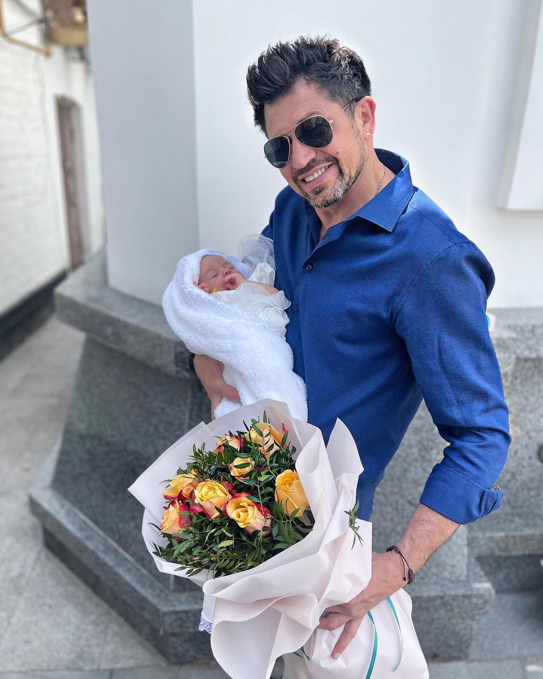 "Время идет и я снова папа…", - отметил шоумен в своем блоге в Instagram. На фотографии он позировал с младенцем на руках и огромным букетом цветов.