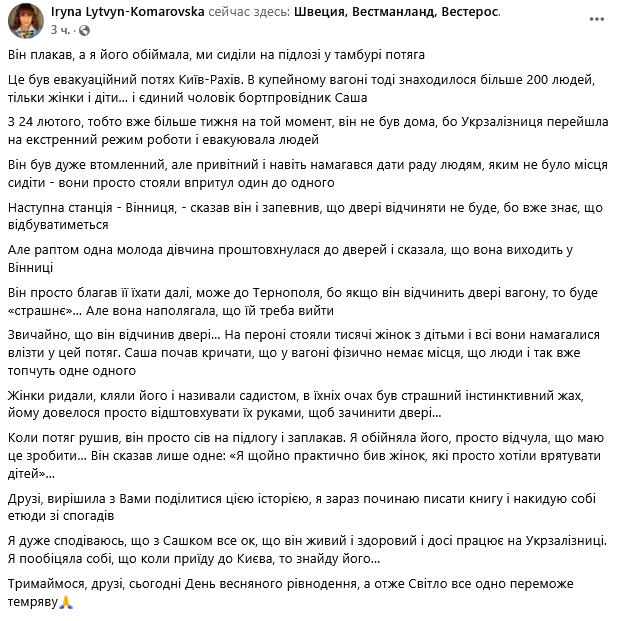 "Это был эвакуационный поезд Киев-Рахов. В купейном вагоне тогда находилось более 200 человек, только женщины и дети... и единственный мужчина бортпроводник Саша. С 24 февраля, то есть уже больше недели на тот момент, он не был дома, потому что Укрзализныця перешла на экстренный режим работы и эвакуировала людей. Он был очень уставший, но приветливый и даже пытался разобраться с людьми, которым не было места сидеть - они просто стояли вплотную друг к другу", - рассказала она.