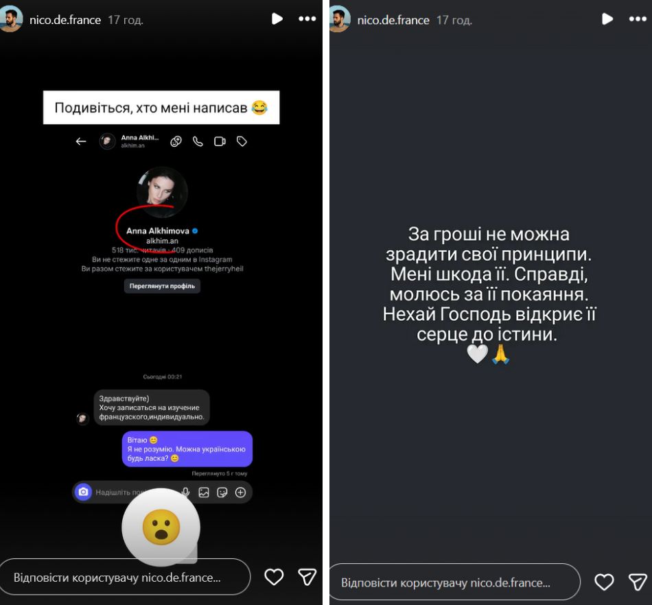 Об инциденте стало известно из Instagram Николя, который в соцсетях называет себя "украиноязычным французом" и "французом с украинской душой". Он опубликовал скриншот короткой переписки с Алхим, подчеркнув, что не готов поступаться собственными убеждениями даже за деньги.