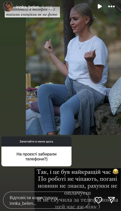 "Да, и это было самое лучшее время. По работе не трогают, плохие новости не знаешь, счета не оплачиваешь. Я не соскучилась за телефоном за это время аж никак", - призналась она.