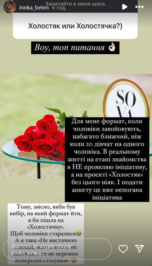 Инна не скрывает, что ей больше нравится формат шоу, где мужчины завоевывают девушку, поэтому, если бы у нее был выбор, то она пошла бы на "Холостячку".