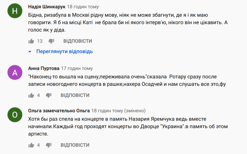 "Бедная, забыла в Москве родной язык, никак не может понять, где и на каком языке говорить", - пишут в комментариях на YouTube. - "Наконец-то вышла на сцену, переживала очень" - сказала Ротару сразу после записи новогоднего концерта в России".