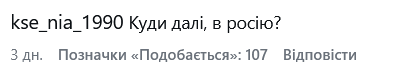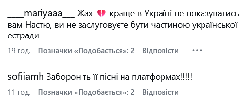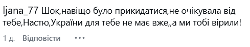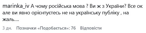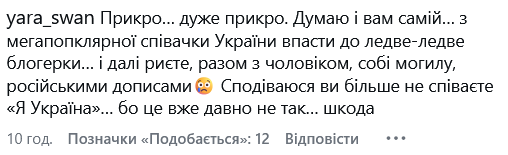 "Досадно… очень досадно. Думаю и вам самой… из мегапоплярной певицы Украины упасть в едва-едва блогершу… и дальше роете, вместе с мужем, себе могилу, русскими постами. Надеюсь вы больше не поете "Я Украина"… потому что это уже давно не так…", - написала одна из подписчиц.