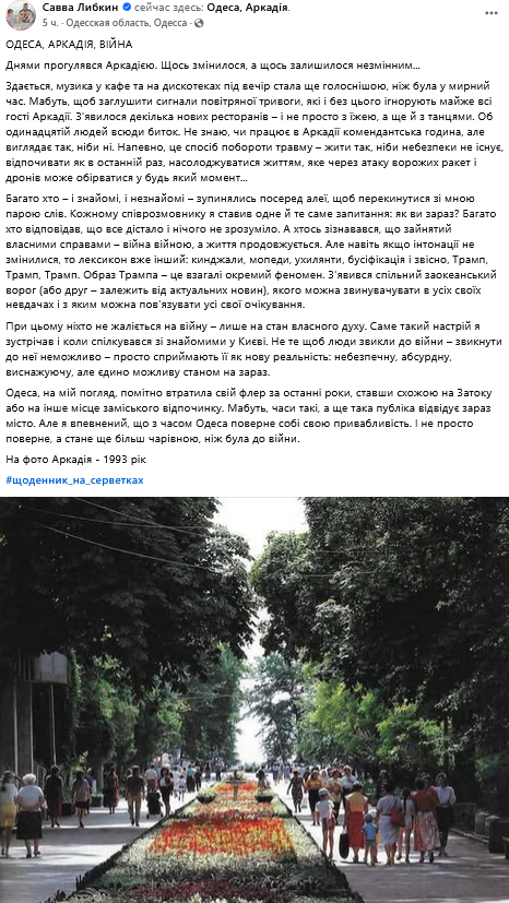 Он отметил, что к такому выводу пришел, прогуливаясь по улицам города. При этом заметил, что никто из одесситов и гостей города не жалуется на войну, а только на состояние собственного духа.