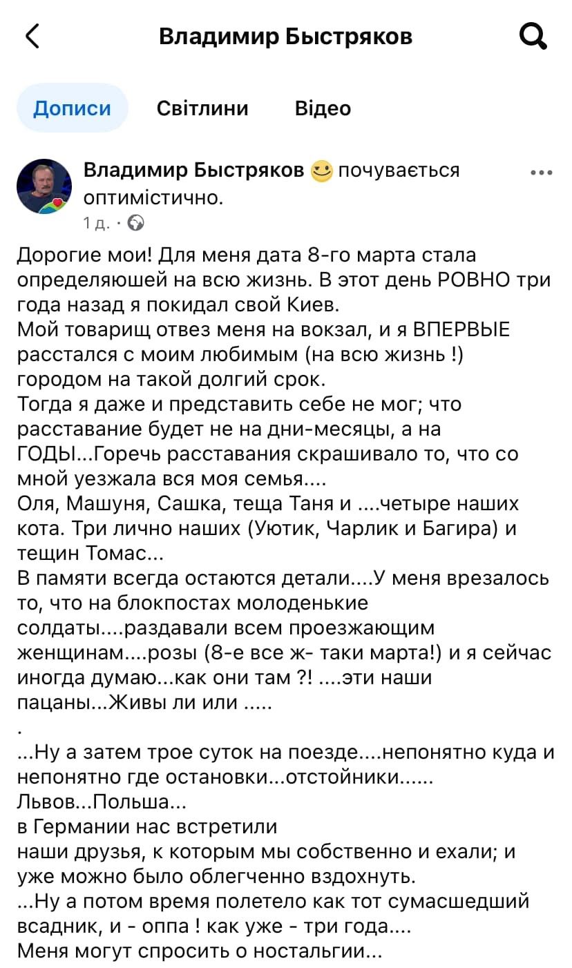 "Ностальгии не возникает по тому Киеву, что СЕЙЧАС... кастрированному, переименованному, с запрещенным родным языком, с ложью из эфира, с отловами людей.... Но вот тот....МОЙ Киев...он никуда не делся; он всегда со мной, и если когда-нибудь я вернусь...я привезу его с собой", - написал Быстряков.