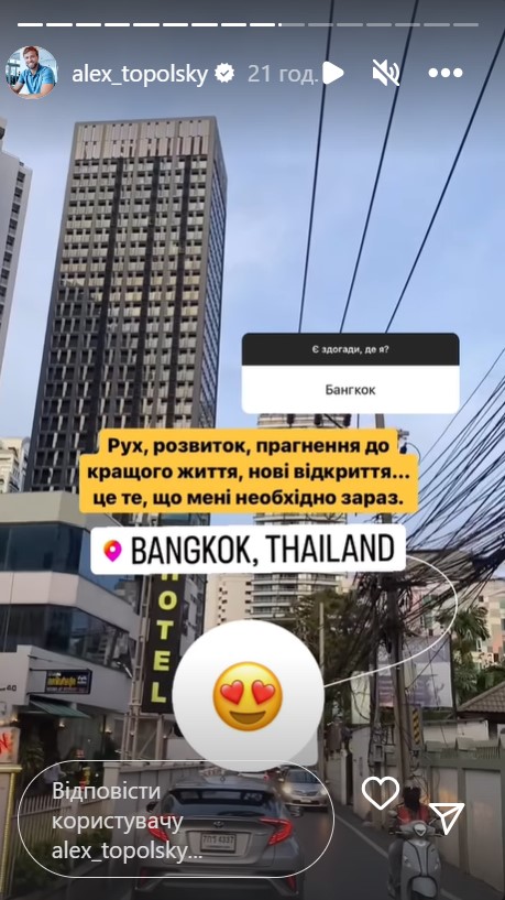 В Instagram Топольский рассказал, что сейчас живет в таиландском городе Бангкок. Переехать он решил потому, что здесь еще больше возможностей для личностного развития.