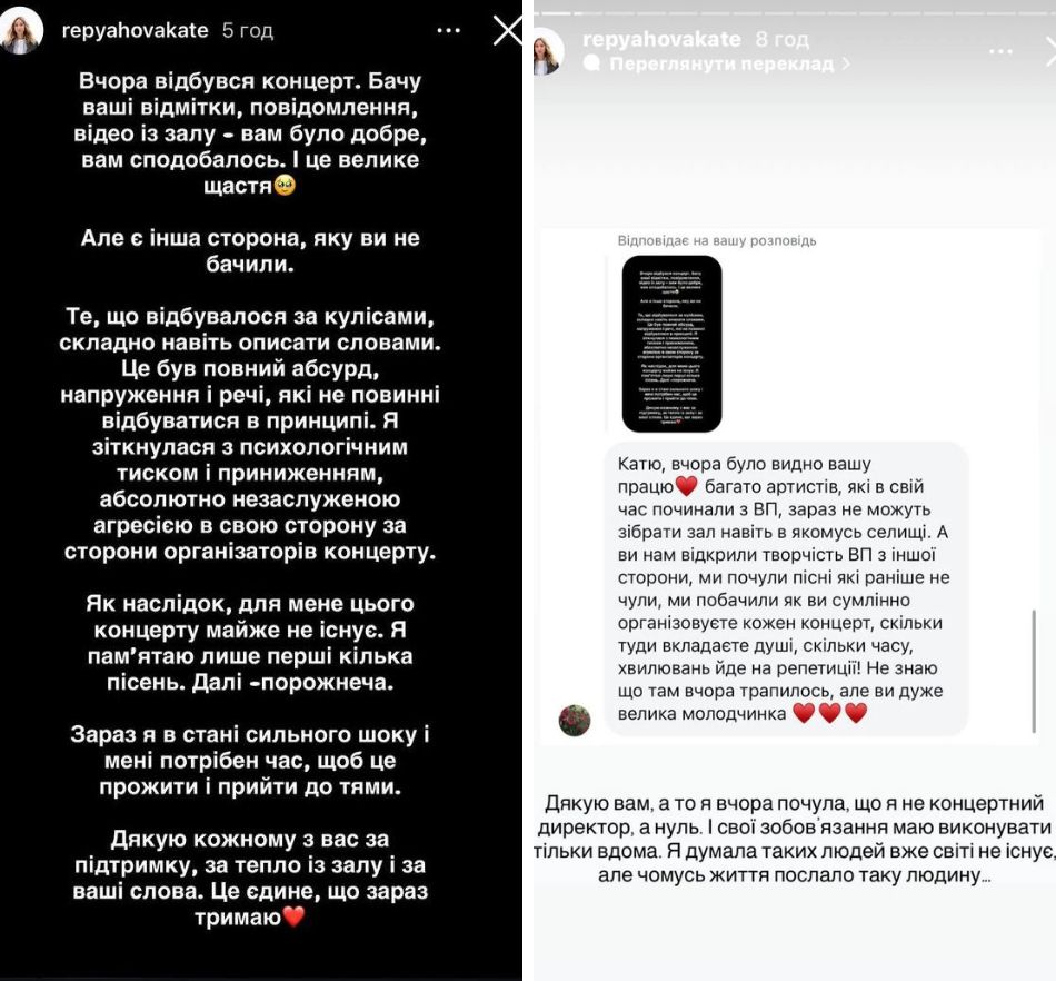 "То, что происходило за кулисами, сложно даже описать словами. Это был полный абсурд, напряжение и вещи, которые не должны происходить в принципе. Я столкнулась с психологическим давлением и унижением, совершенно незаслуженной агрессией в мой адрес со стороны организаторов концерта. В результате для меня этого концерта почти не существует. Я помню только первые несколько песен. Дальше - пустота", - рассказала Репяхова.