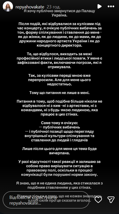 "Потому что дело не только во мне. Дело в том, чтобы подобное больше никогда не повторялось ни с кем - ни с артистами, ни с командами, ни с каким-либо человеком, работающим в этих стенах. Именно поэтому я жду: публичных извинений и публичной позиции по поводу пересмотра внутренней культуры общения и отношения к людям и зрителям. Только после этого для меня эта тема будет исчерпана", - пояснила она.