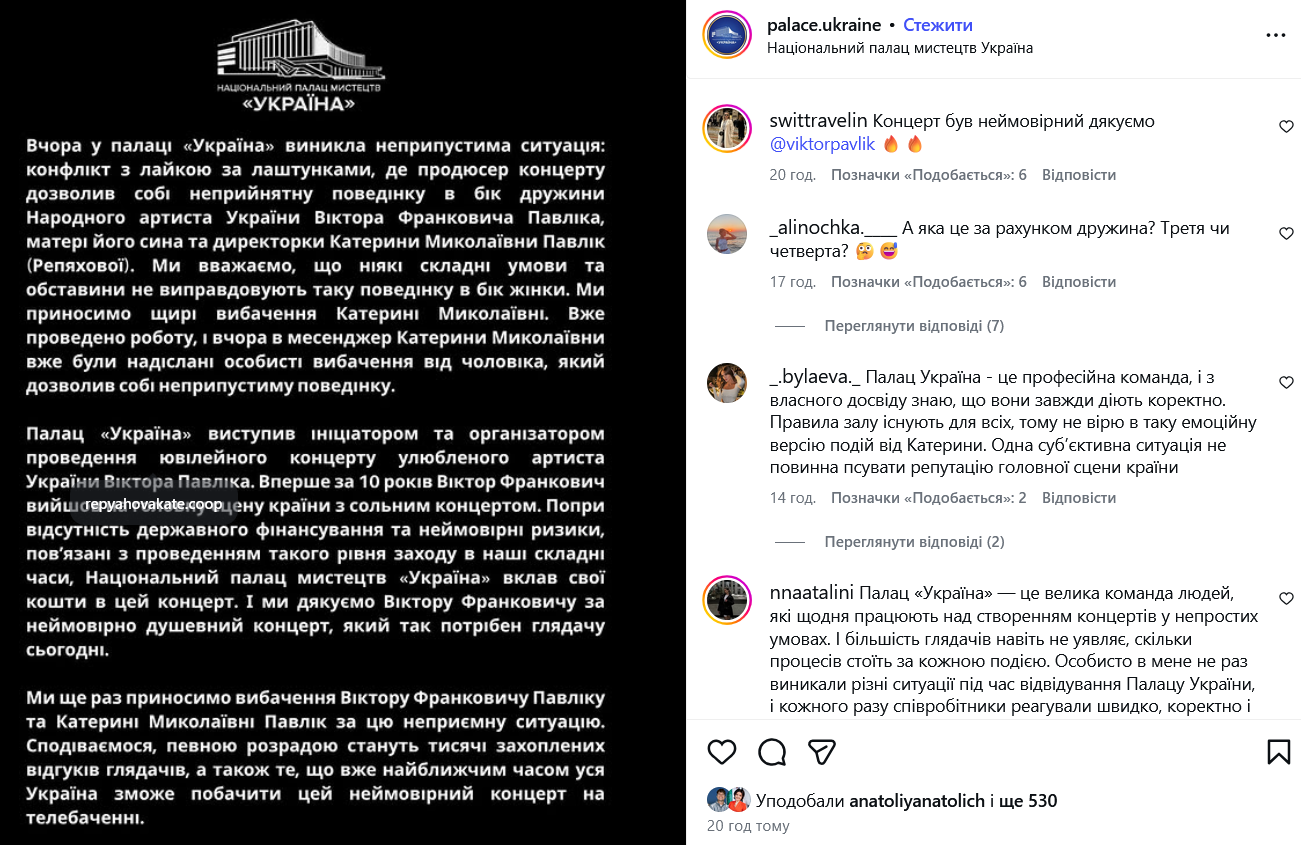 "Мы считаем, что никакие сложные условия и обстоятельства не оправдывают такое поведение по отношению к женщине. Мы приносим искренние извинения Екатерине Николаевне. Уже проведена работа, и вчера в мессенджер Екатерины Николаевны были отправлены личные извинения от мужчины, который позволил себе недопустимое поведени", – отметили представители Дворца "Украина".