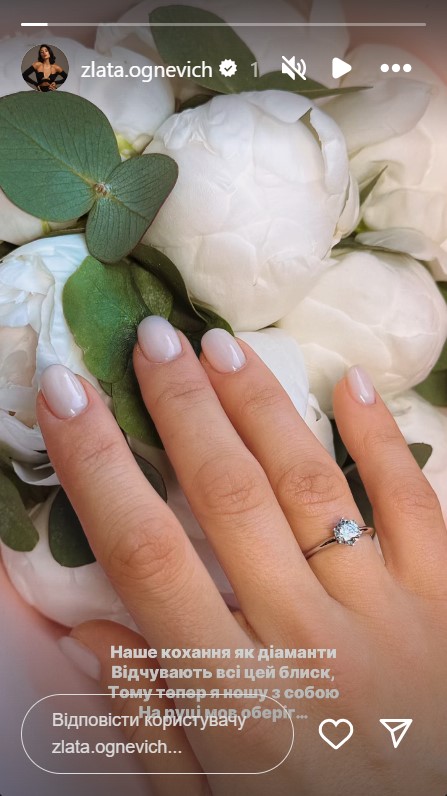 Злата Огневич, которая недавно высказалась о планах касательно семьи и детей, заинтриговала поклонников новым фото. В соцсетях она опубликовала кадр, на котором засветила кольцо на безымянном пальце. Кадр был сделан на фоне белых пионов.
