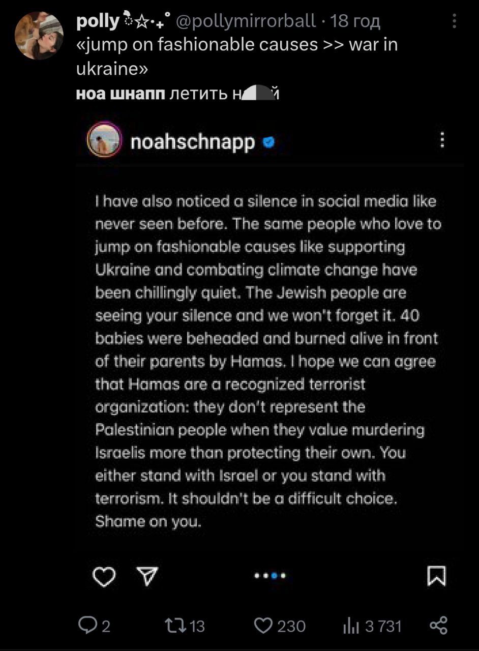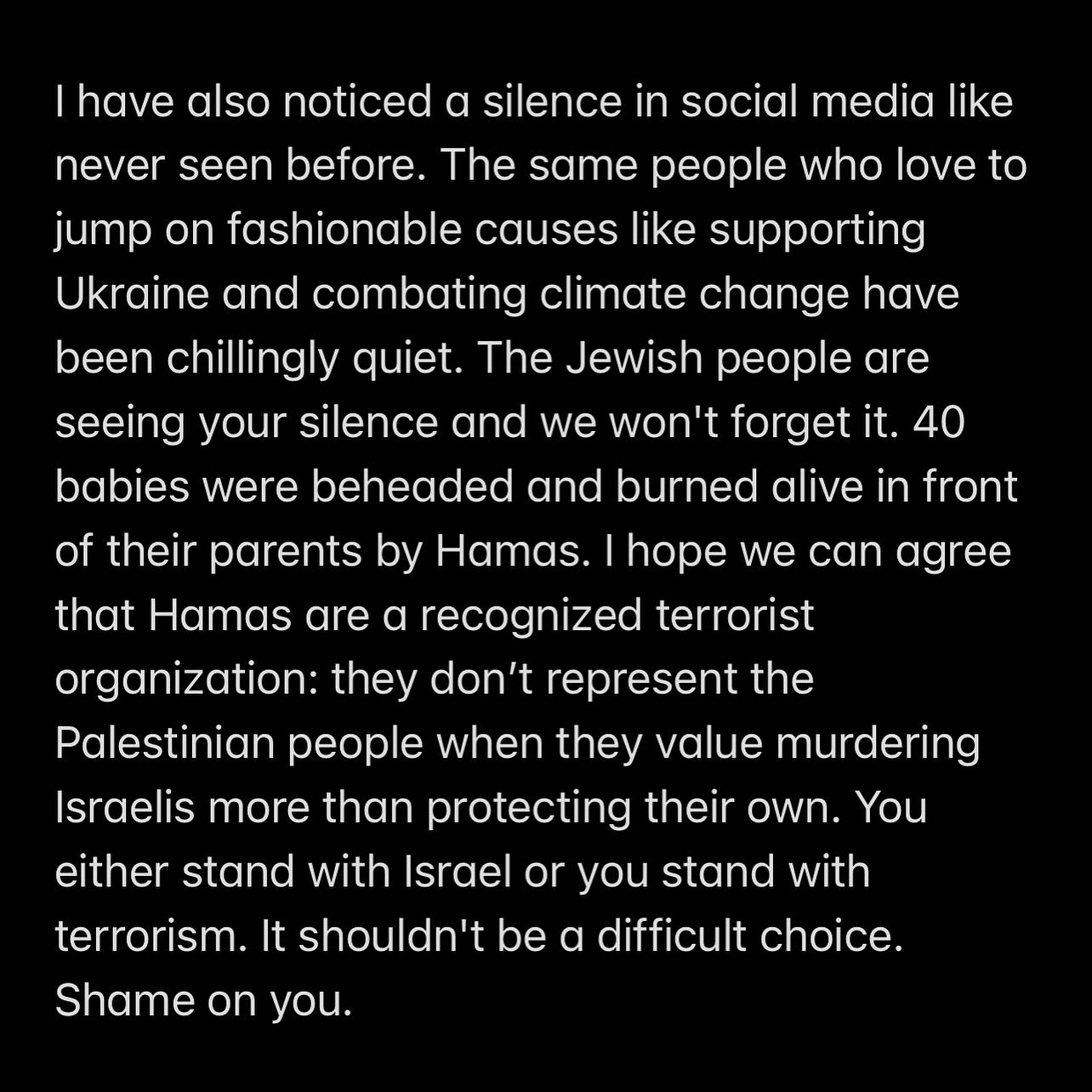 "Я заметил, что в соцсетях тихо, как никогда. Те самые люди, которые с радостью запрыгнули в модные темы вроде поддержки Украины или борьбы с изменением климата, сейчас спокойно притихли. Еврейский народ видит ваше молчание, и мы этого не забудем, - написал Шнапп. - 40 младенцев были обезглавлены ХАМАСом и сожжены на глазах у родителей. Я надеюсь, мы можем прийти к согласию, что ХАМАС - террористическая организация. Они не представляют народ Палестины, когда предпочитать убивать израильтян, а не защищать своих людей. Вы либо становитесь на сторону Израиля, либо поддерживаете терроризм. Это не сложны выбор. Вам должно быть стыдно".