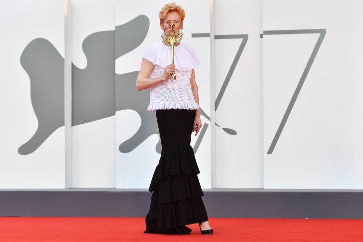 Тильда Суинтон в топе и юбке Chanel. Золотую карнавальную маску, которую она несла, позже обменяли на статуэтку "Золотой лев" за жизненные заслуги.