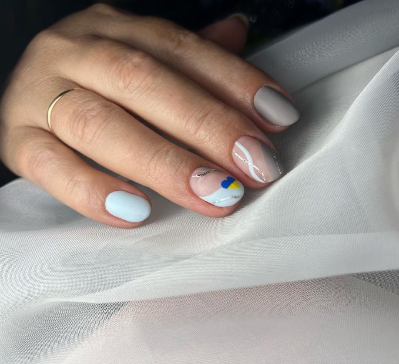 Еще один вариант нежного маникюра – в серо-голубых пастельных оттенках. Дополнить его можно оригинальным французским маникюром на одном ногте, а также волнистыми линиями или абстрактным рисунком на другом. Еще один способ выделиться – нарисовать сердце и разукрасить его желто-голубыми патриотическими цветами.