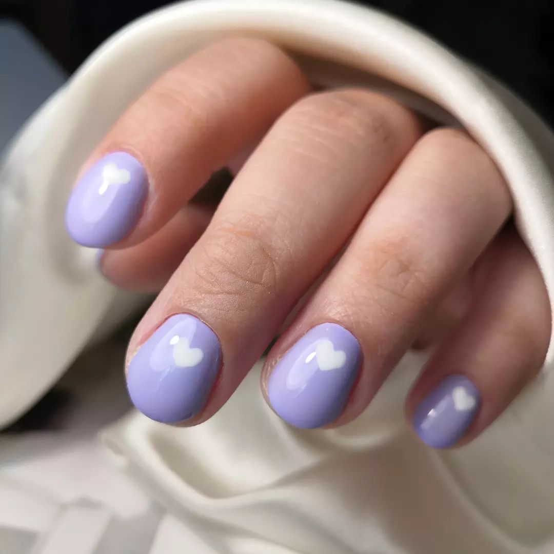 Еще один стильный, но в то же время нежный оттенок на лето – лавандово-лиловый. Вы можете оставить однотонное покрытие или же разнообразить его дизайном в виде точек или сердечек у основания ногтей, сделанных белым гель-лаком.