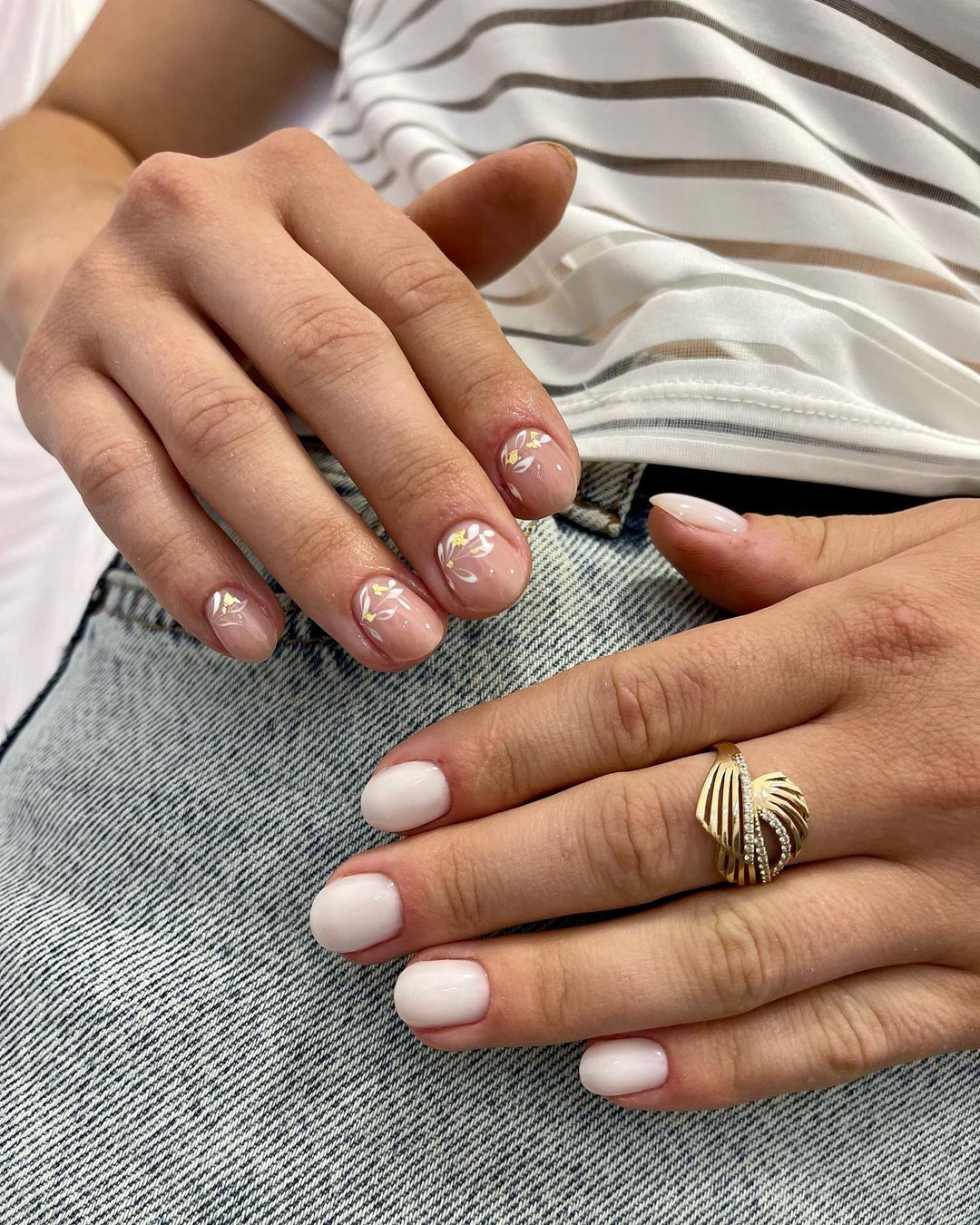 Еще один стильный дизайн на короткие ногти: ногти на одной руке покрываем белым или молочным оттенком, а на второй – прозрачным. Их также можно украсить лиственным или цветочным узором с помощью стемпинга или рисунка.