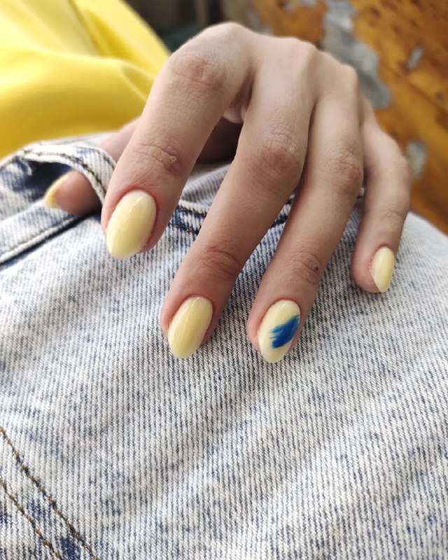 Если вы любите минимализм, но все же хотите разнообразить однотонное покрытие, выбирайте нежно-желтый оттенок. На одном ногте сделайте мазок синим – так получится оригинальный маникюр в патриотической гамме.