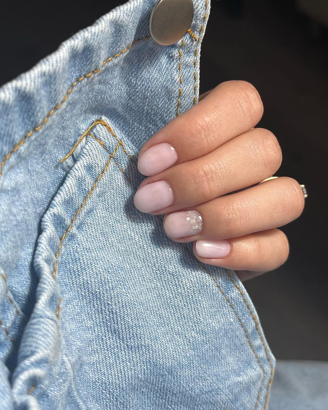 Многие модницы отдают предпочтение полупрозрачному покрытию на ногтях, которое красиво смотрится как на коротких, так и на длинных ногтях. Такой дизайн можно дополнить мелкой россыпью блесток у основания ногтя на одном или нескольких пальцах.