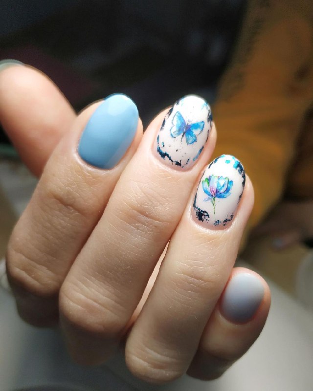 Еще один вариант нежного маникюра – в молочно-голубой пастельной гамме. Разнообразить его можно наклейками в виде цветка и бабочки, а также дизайном с разноцветной фольгой.
