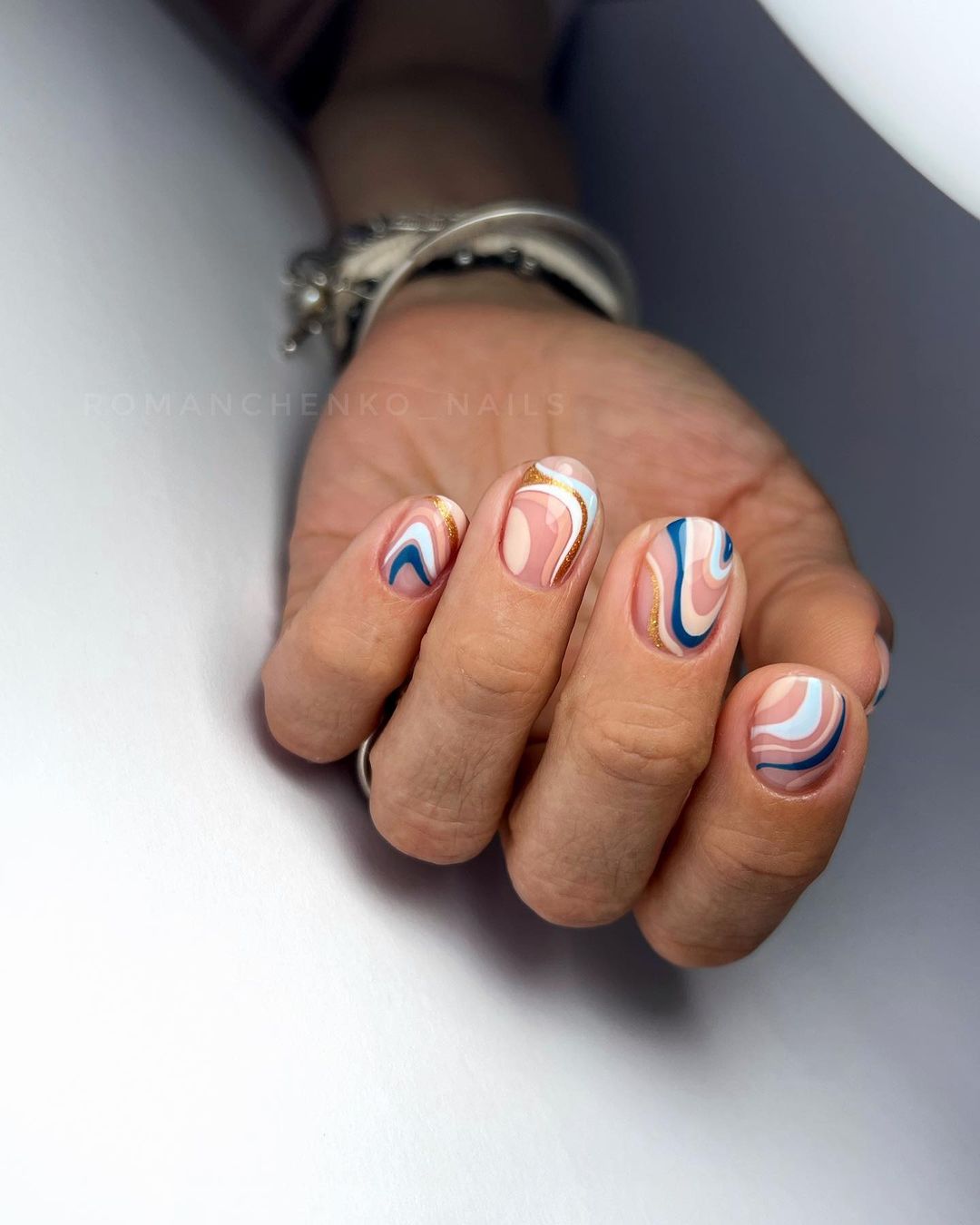 Также на коротких ногтях будет красиво смотреться волнистый маникюр. Комбинируя разные цвета, вы получите оригинальный узор на каждом пальце – с таким маникюром вас точно заметят в компании или на светском мероприятии.