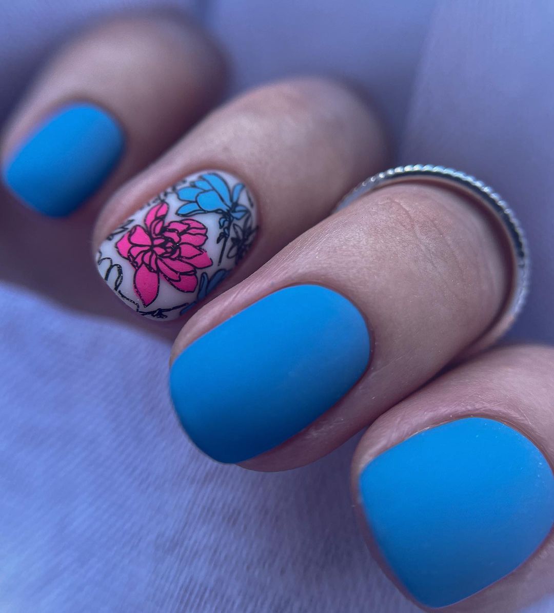 Также можно покрыть ногти насыщенным синим цветом, а один из них оставить прозрачным. Дополнить такой дизайн можно черным стемпингом - то есть перенесением на ноготь при помощи штампа рисунка с трафарета. Для создания нежного образа выбирайте цветочные узоры, которые можно дополнительно разукрасить, а также матовый топ.