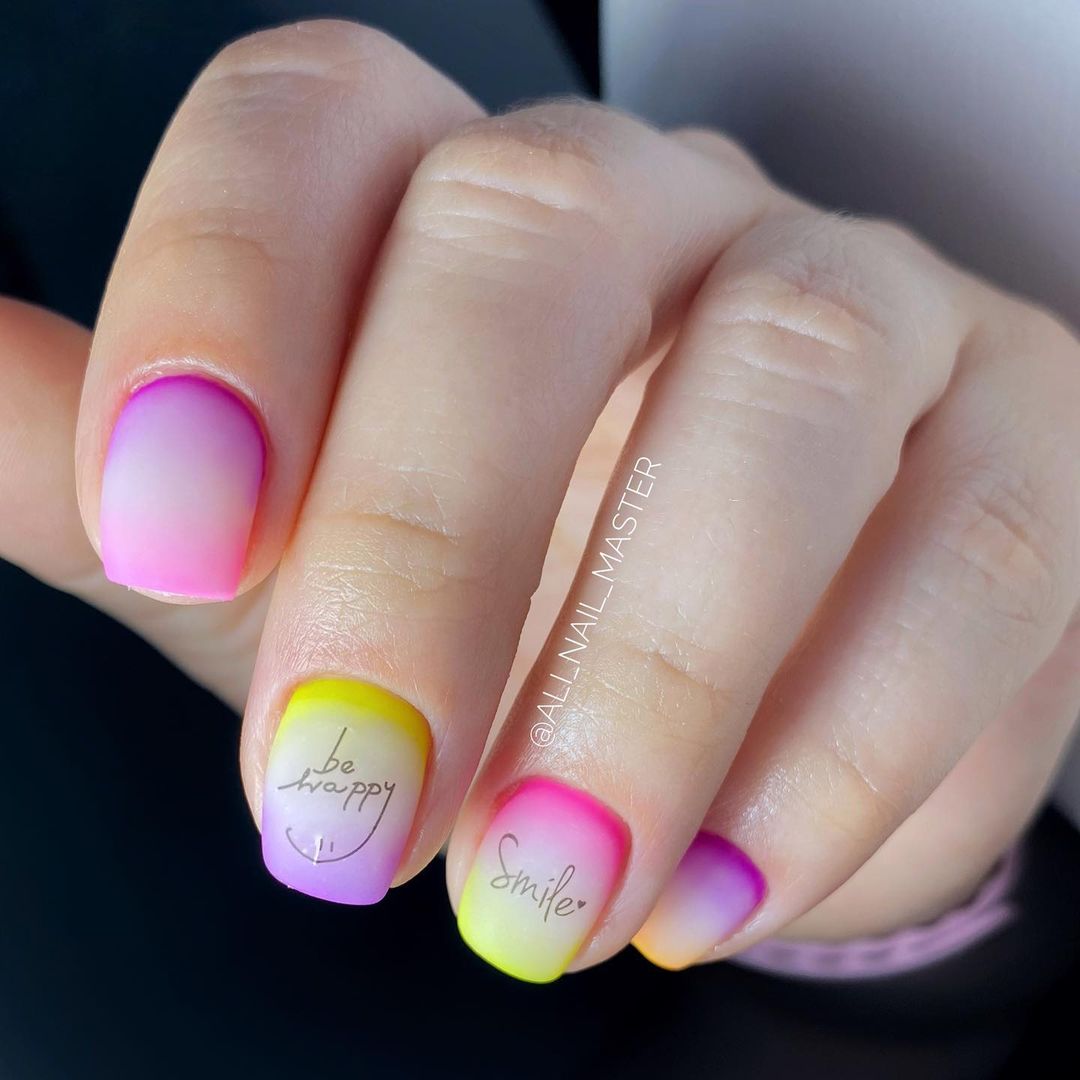 Еще один смелый вариант – градиентный маникюр на коротких ногтях. Выберите 2-3 контрастных оттенка и скомбинируйте их по-разному на каждом ногте, сделав плавный переход от одного цвета к другому. Дополнить такой дизайн можно надписями.