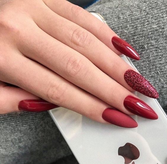 У многих 14 февраля ассоциируется с красным цветом – цветом любви и страсти. Поэтому, если вы не любите картинки или узоры на ногтях, советуем сделать однотонный маникюр. Правда, его можно разнообразить блестками или матовым покрытием.